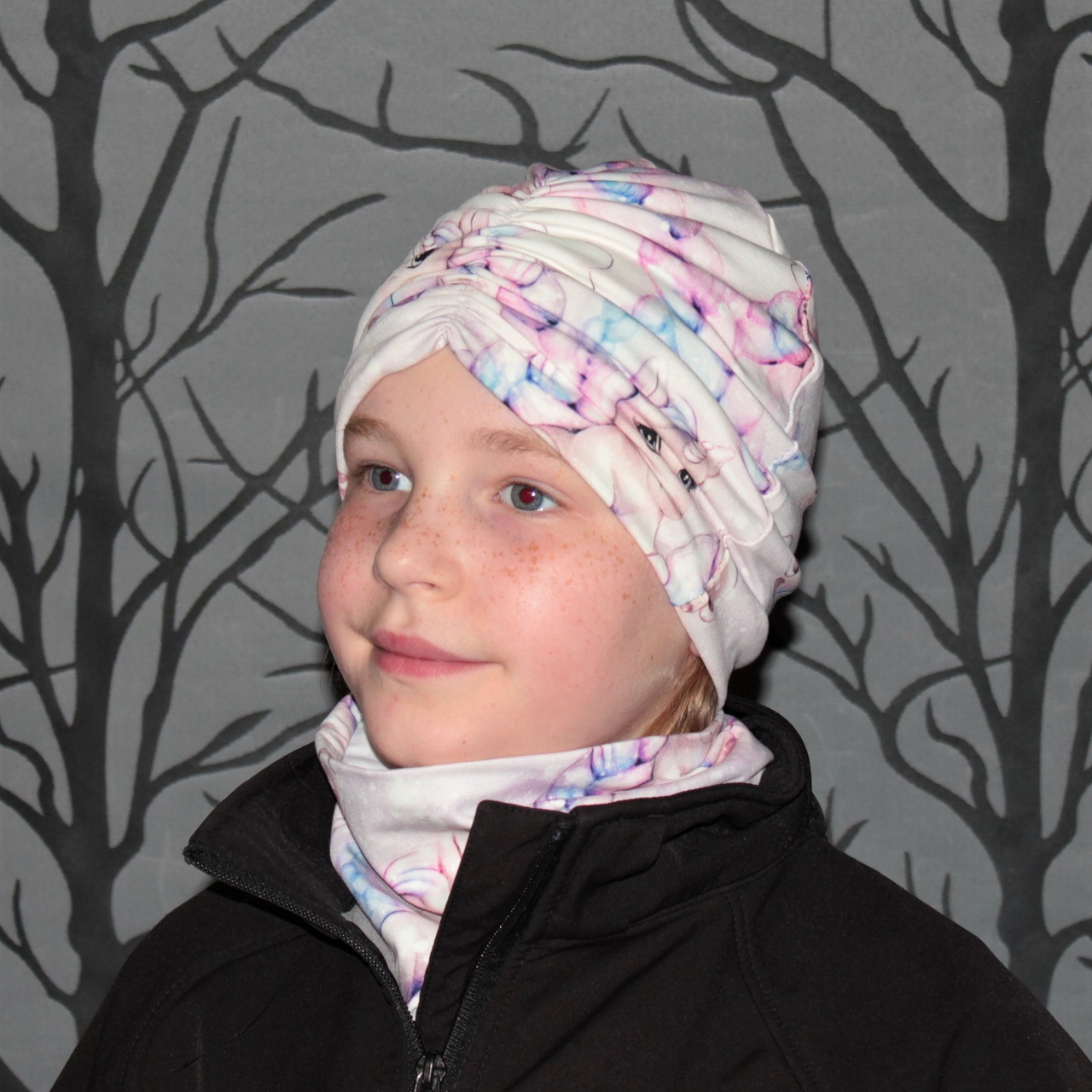 Edestä rypytetty pipo kaksinkertaista puuvilltrikoota. 92% puuvillaa 8% elastaania. Pesu 40, ei rumpukuivausta, 1 pisteen silitys.